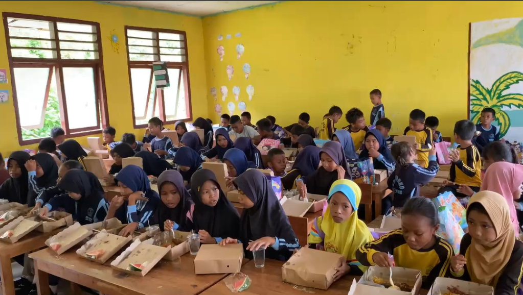 PT. YELLU MUTIARA membagikan makan siang bergizi kepada anak sekolah SDN 23 Dabatan, Raja Ampat.